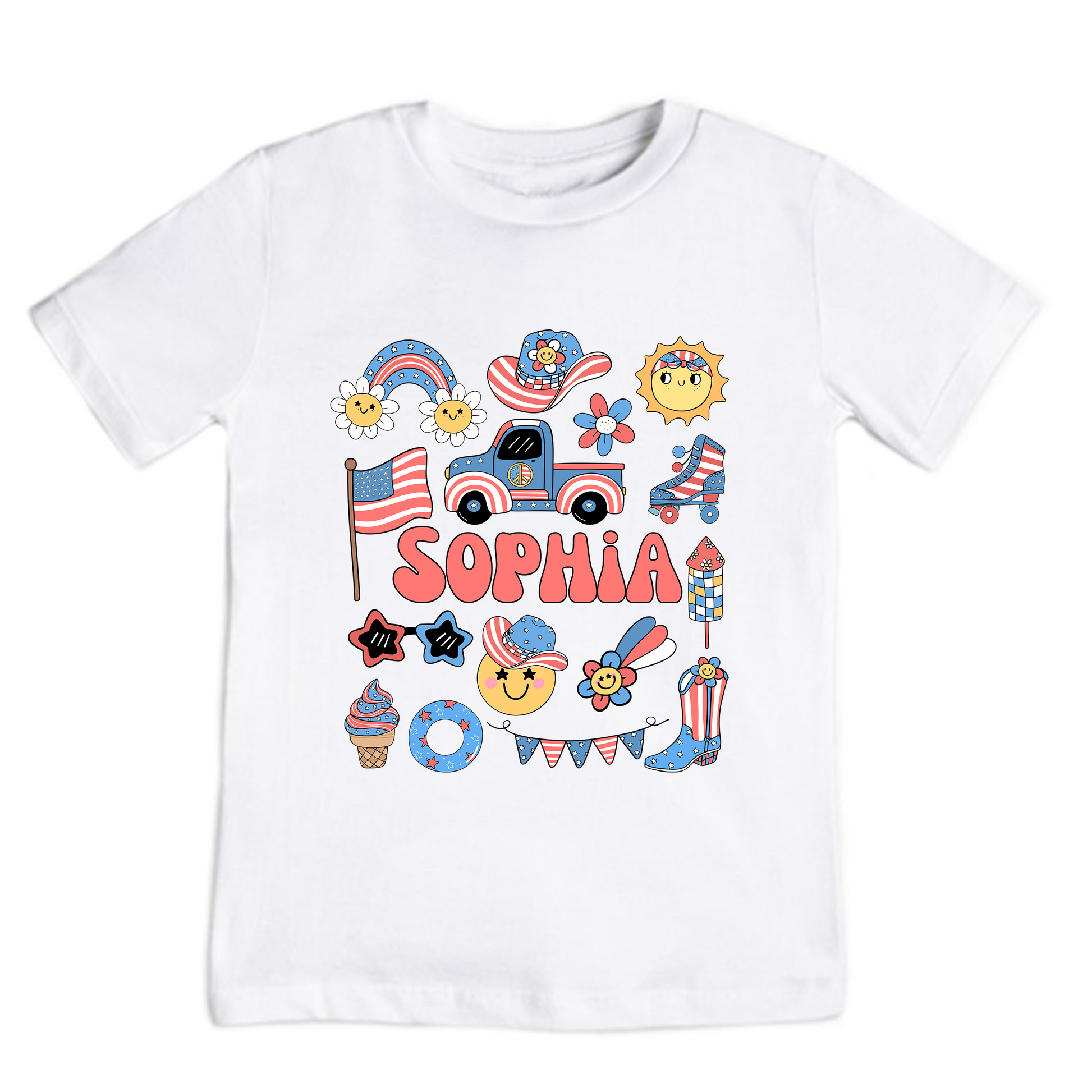 Make your little girl’s 4th of July extra special with this custom name patriotic shirt! Featuring fun red, white, and blue illustrations like smiley faces, fireworks, hats, flags, and more — this festive tee can be personalized with your child's name in bold lettering.
