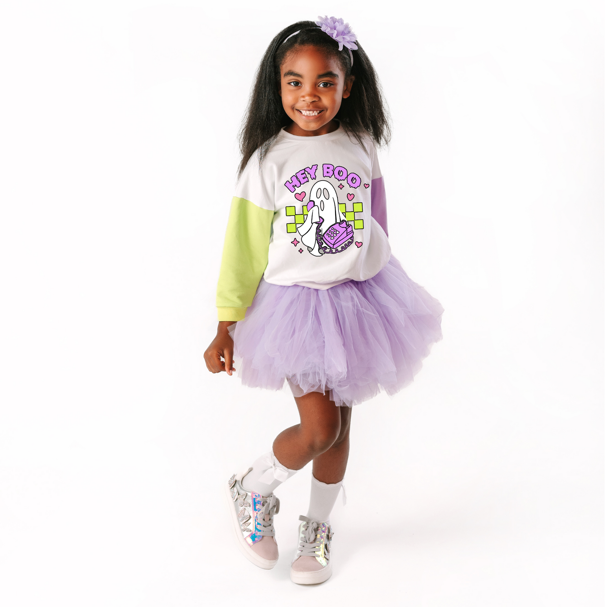 Say “Hey Boo!” to the cutest fall pullover. Our Hey Boo Ghost Calling Sweatshirt features a playful ghost chatting on a retro phone, surrounded by pastel hearts and neon checkerboard accents. With soft fabric and colorful contrast sleeves, it’s the perfect Halloween sweatshirt for pumpkin patch outings, school parties, trick-or-treating, or cozy everyday wear.