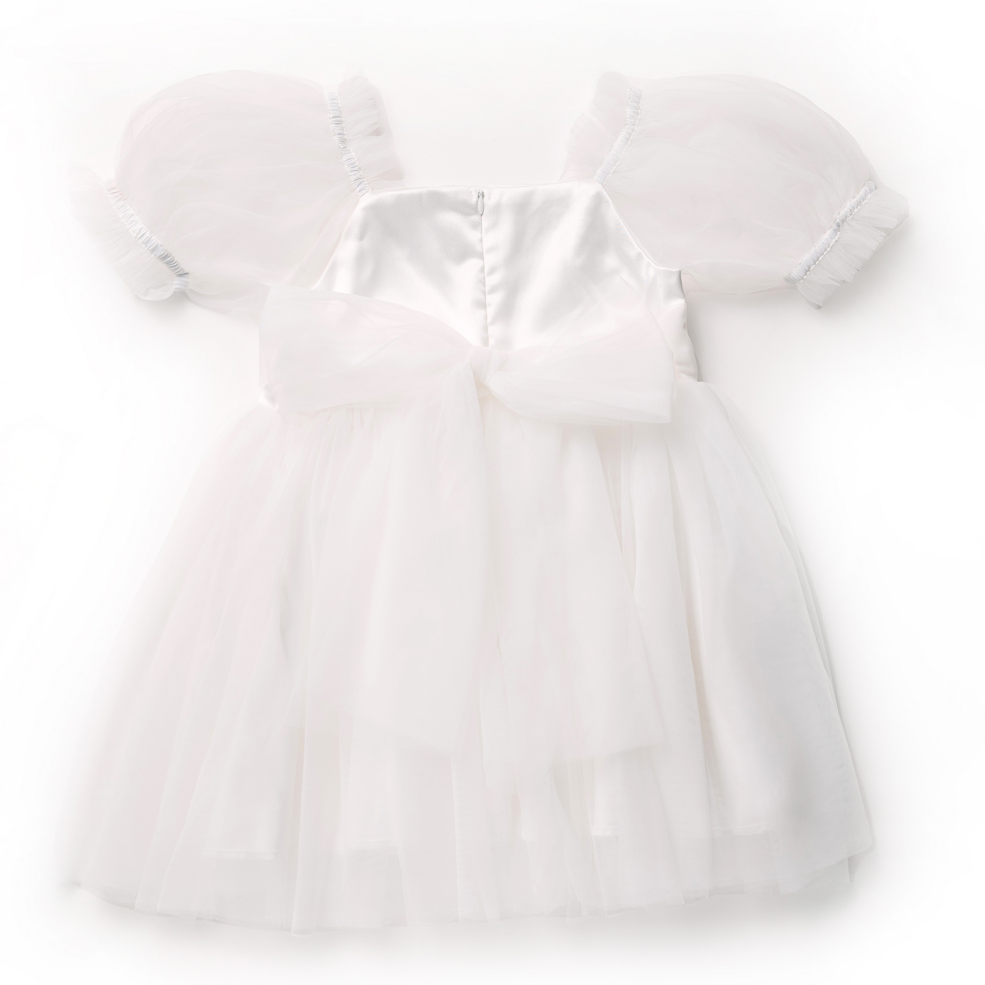 This charming ivory dress is perfect for special occasions! It features adorable puff sleeves that add a touch of playfulness and a stylish tie-back bow for a classic, elegant look. Made from soft, high-quality fabric, it's as comfortable as it is beautiful, making it ideal for weddings, birthday parties, or any memorable event. Your little one will shine with timeless grace in this must-have dress!