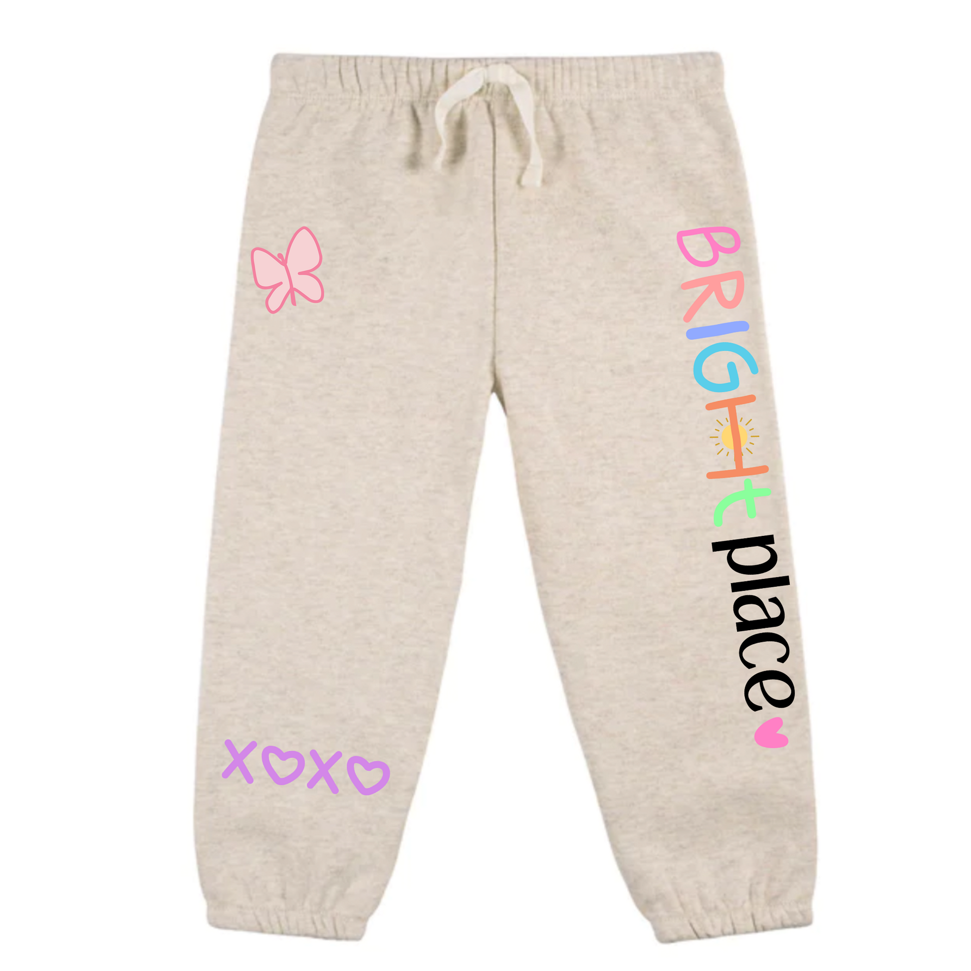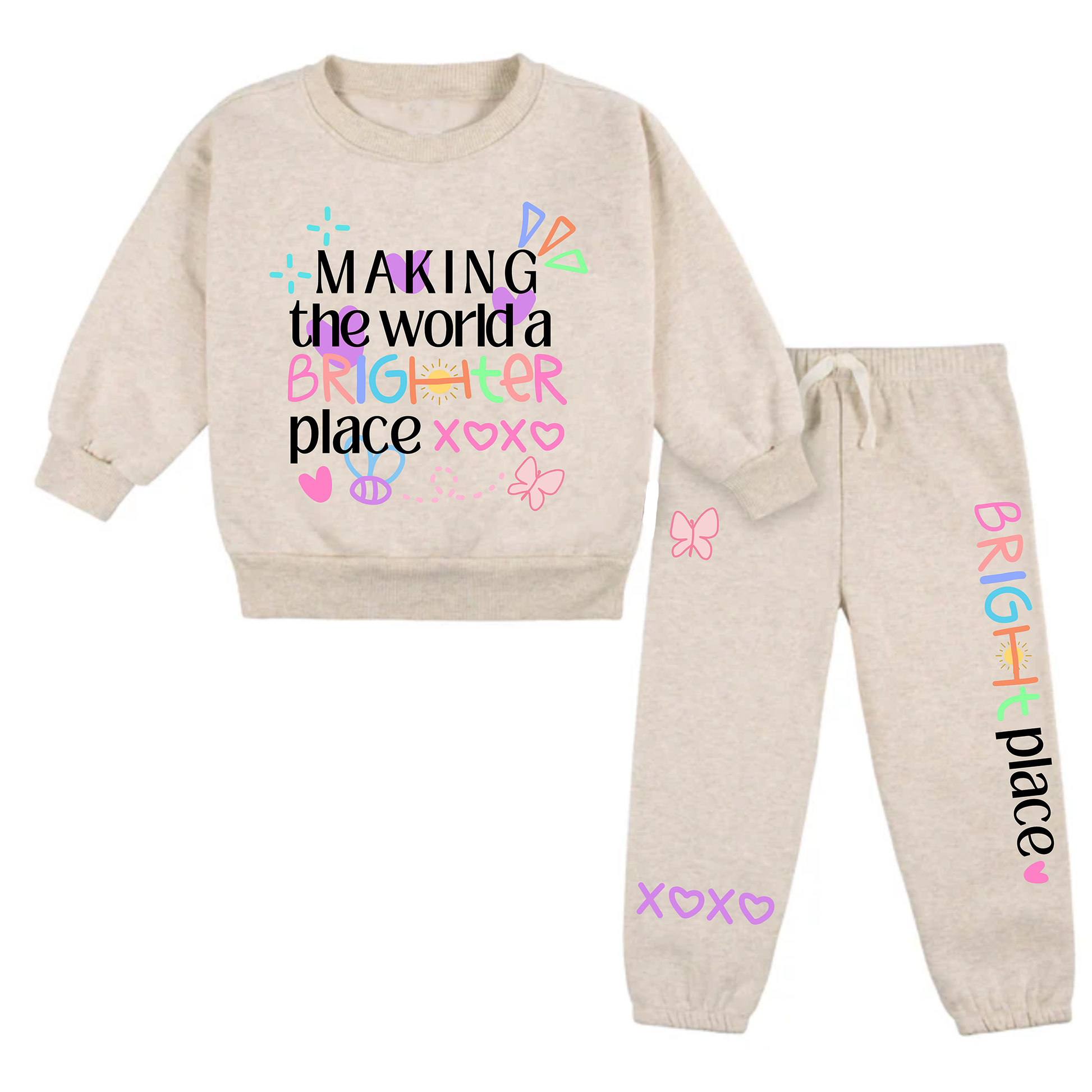 Brighten your little one's wardrobe with our 'Making the World a Brighter Place' Matching Set! This adorable beige crewneck sweater and jogger pants combo features vibrant, playful designs with colorful text and charming details like hearts, butterflies, and sunshine accents. Made from soft, breathable fabric, it's perfect for staying comfy while spreading positivity. Whether for lounging at home or out-and-about adventures, this set is a stylish and cozy choice that your child will love!